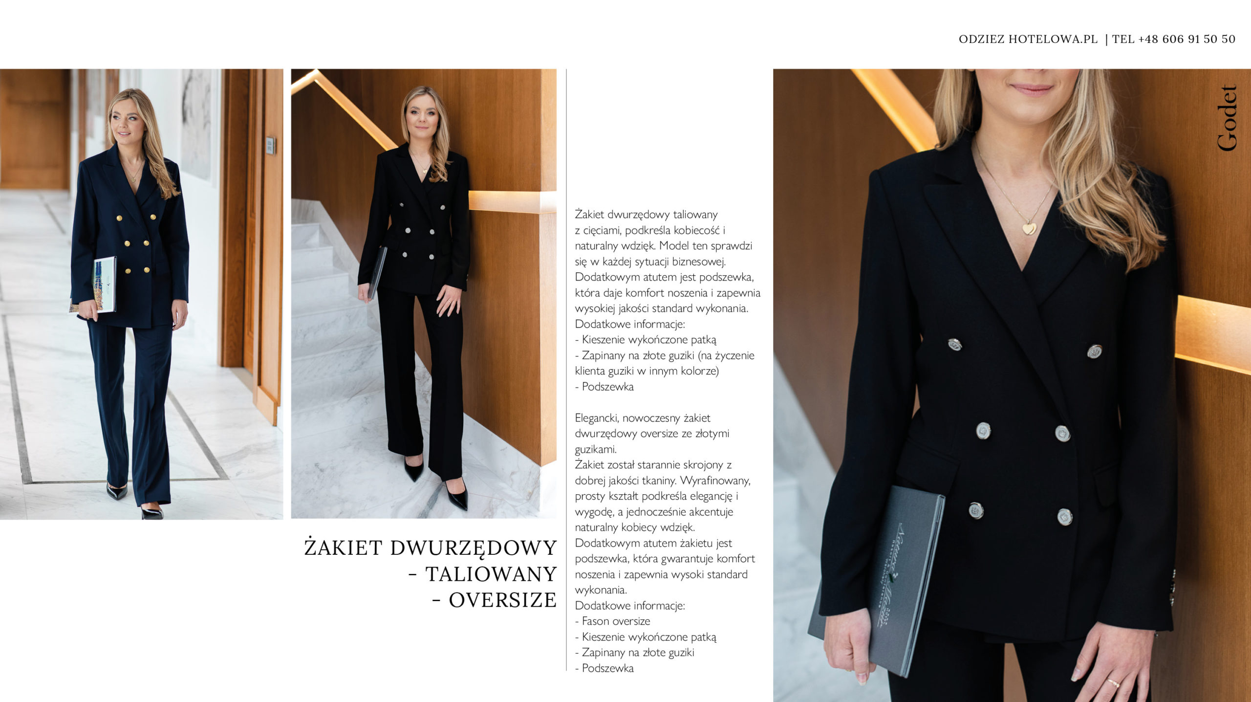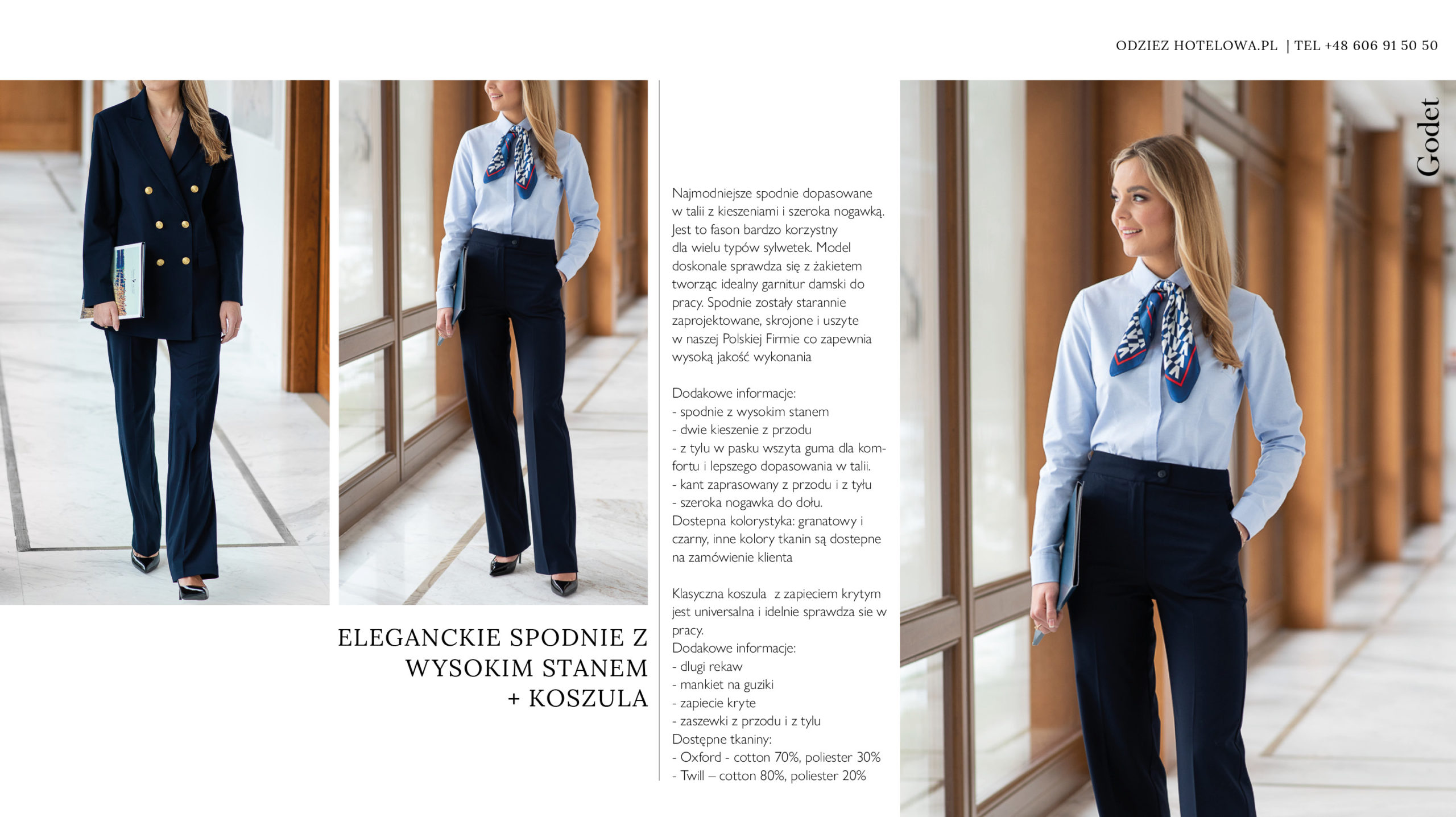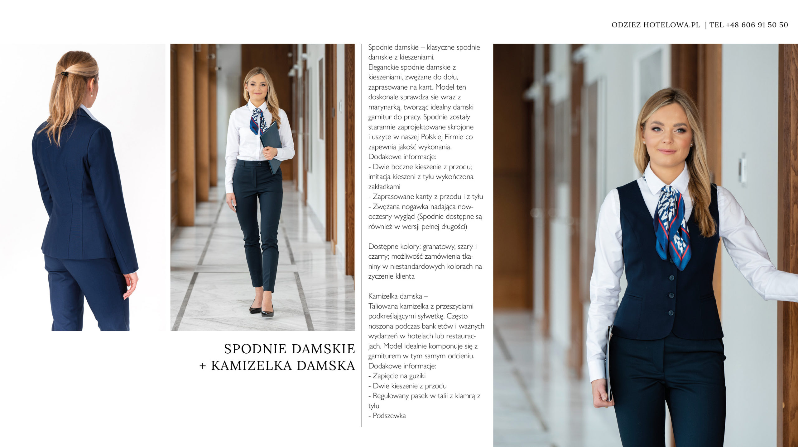 Odzież hotelowa – oferta obejmuje szyte na miarę żakiety, kostiumy, koszule, bluzki, spodnie i spódnice, odzież do pracy w SPA.